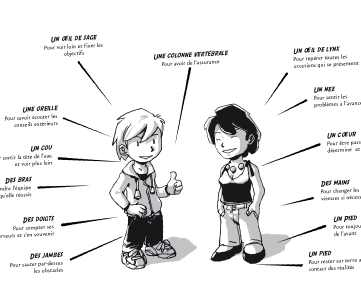 - p. 6 à 24 (pages paires) : Les 10 étapes de la création d'entreprise dessinées en BD