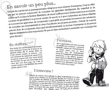 En regard de chaque page de BD se trouve une page d'approfondissement du thème. Explications plus détaillées, statistique rigolote, anecdote vécue, interview d'entrepreneurs...